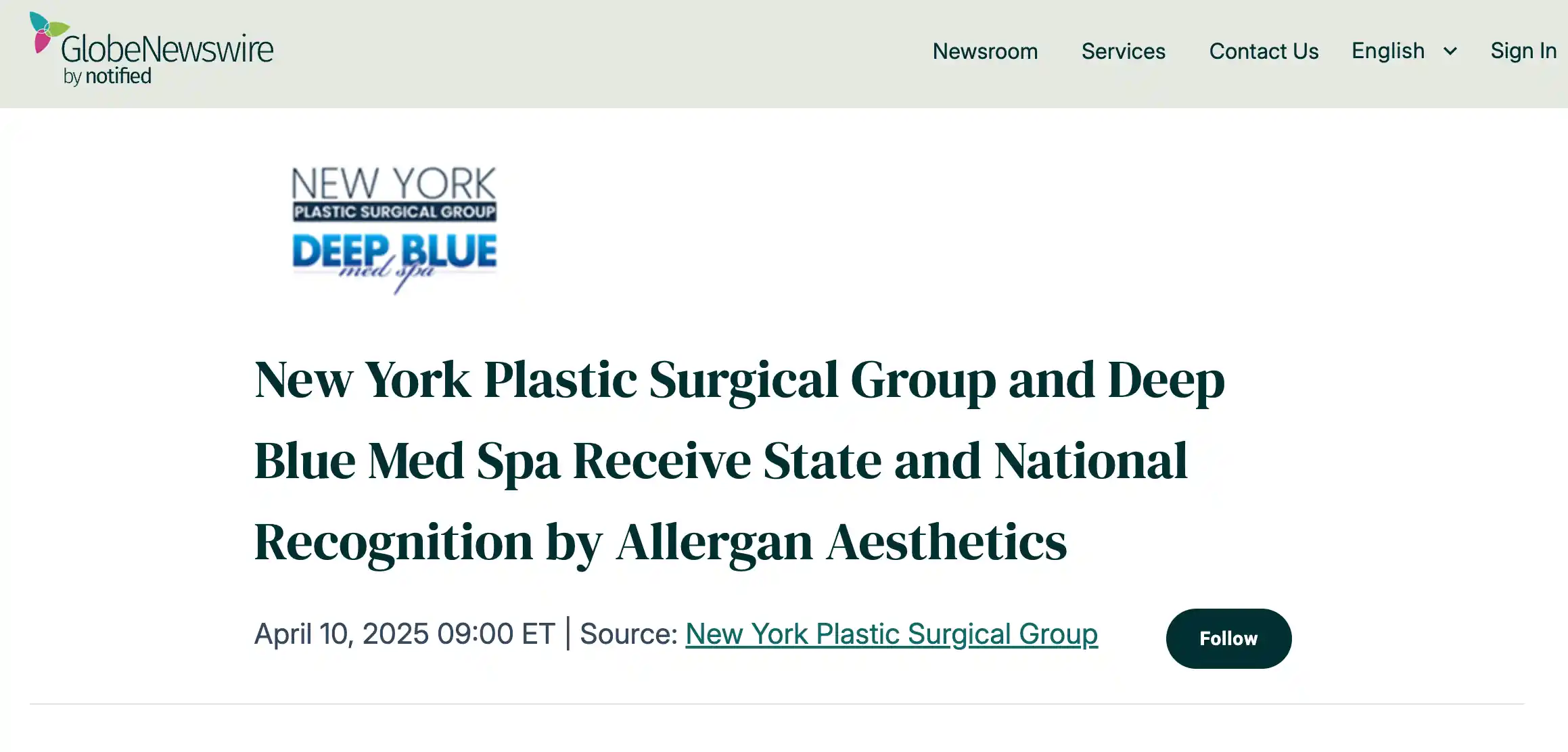 Garden City, NY, April 10, 2025 (GLOBE NEWSWIRE) — New York Plastic Surgical Group and Deep Blue Med Spa have been named the #1 provider of Allergan products in New York State. In addition, they have been ranked in the top 25 nationally. This distinction places them in the top 1% of over 30,000 Allergan medical aesthetic practices throughout the country.